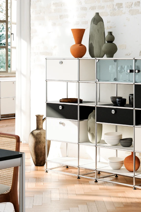 Ob Theke, Barwagen oder Regal für Geschirr – modulare Möbel von USM passen sich deinen Bedürfnissen an.